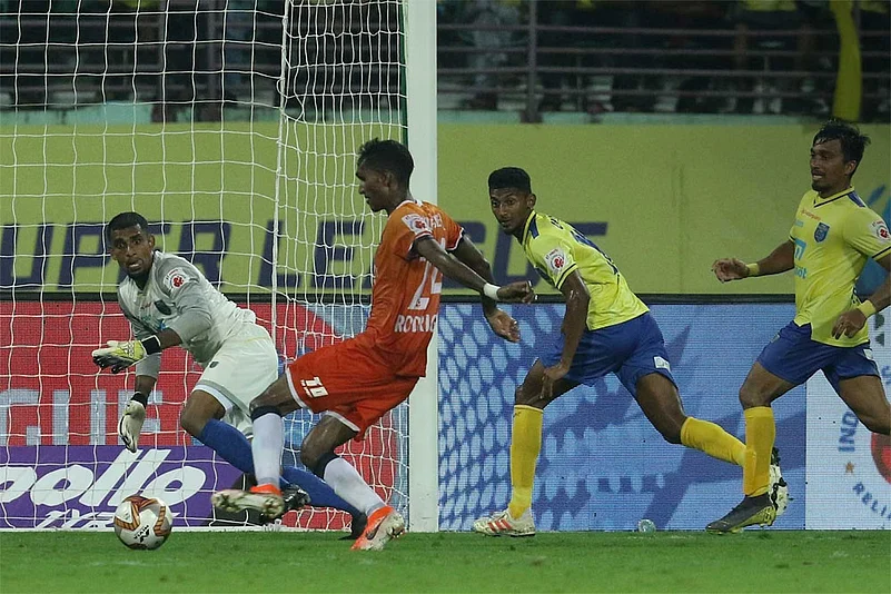 FC Goa struggled to regrouped immediately as Kerala Blasters' energetic midfield denied their counterparts time and space to pick out their passes. Brandon Fernandes escaped his marker's attention in the 18th minute, but his through ball was too heavy for an overlapping Mandar Rao Dessai.