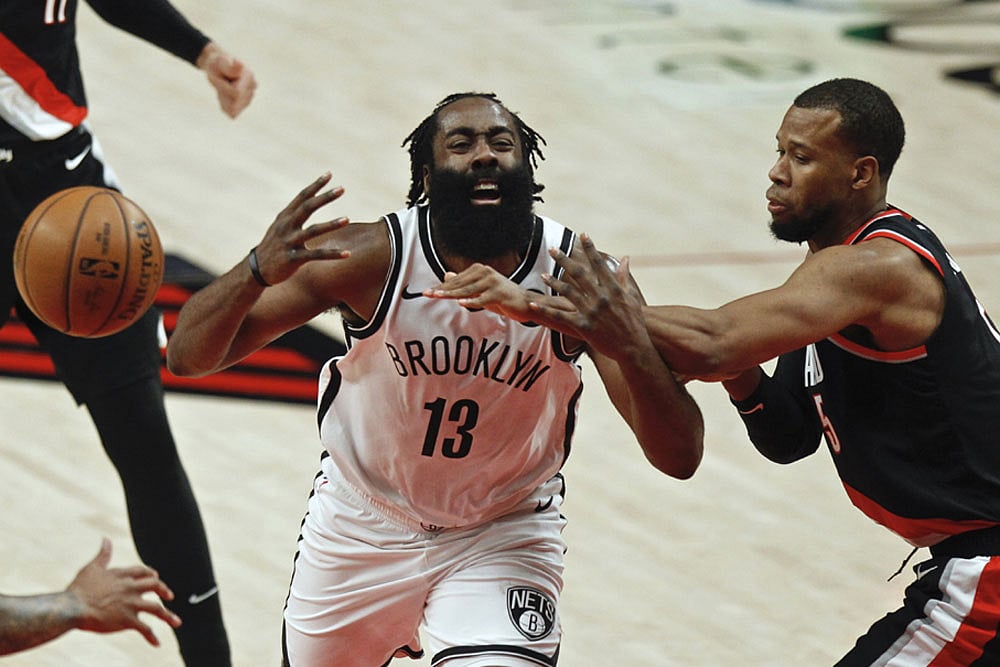 James Harden led the way with a double-double as the star-studded Nets topped the Portland Trail Blazers 116-112.
