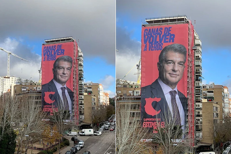 Laporta posted two images of the poster, placed on a building under construction within view of the stadium of Barca's arch rivals, on his Twitter account with the caption "Hello Madrid".