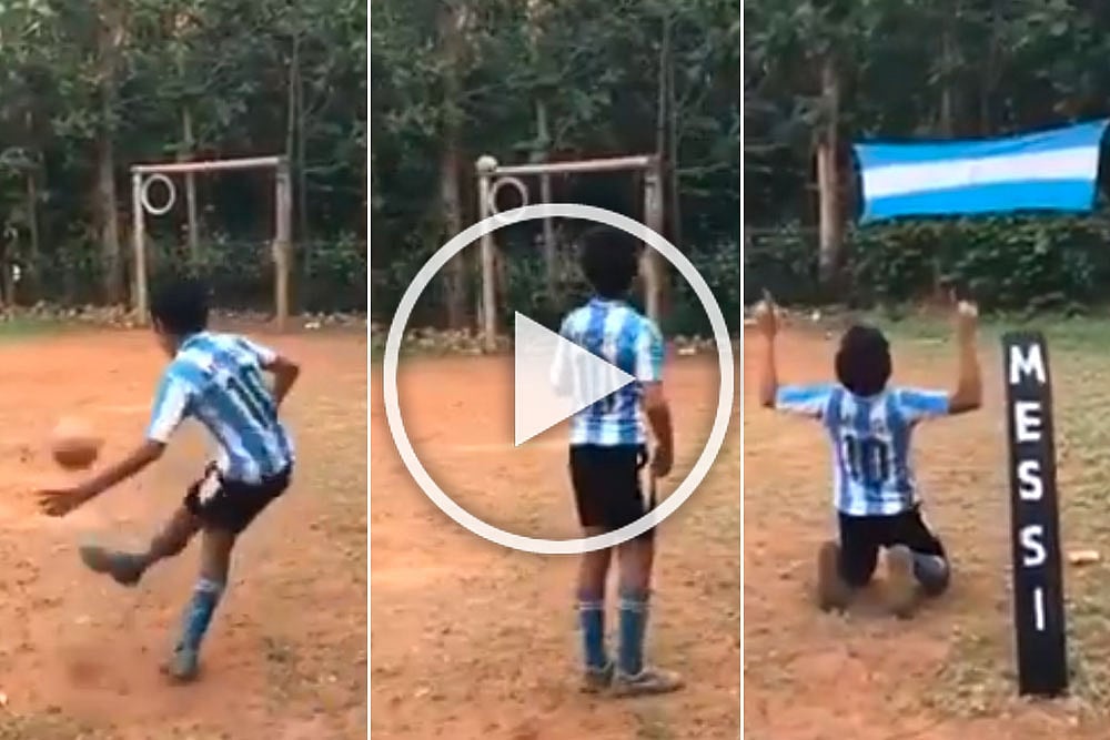 He then proceeds to kick the ball that curls into the hoop hung on the top corner of the post. He is wearing the shirt of Argentina and Barcelona star Lionel Messi.