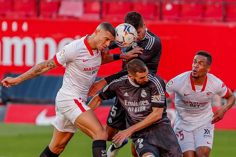 Karim Benzema was waiting to nod in from close range but was beaten to the ball by defender Diego Carlos, who cushioned a header to the relieved Bounou.