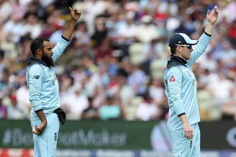 Captain Eoin Morgan and Adil Rashid setting the field. AP Photo