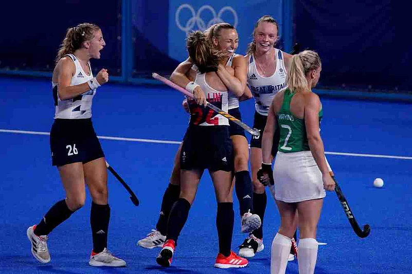 Britain's Hannah Martin, centre right, celebrates with her teammates after scoring against Ireland during a women's hockey match, Saturday, July 31, 2021, in Tokyo, Japan. Britain's win sent India into the quarterfinals in women's hockey Photo: AP