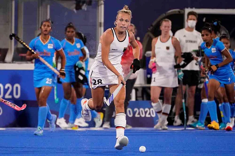 Germany's Jette Louisa Fleschutz runs the ball up the field during a women's hockey match against India at the 2020 Summer Olympics, Monday, July 26, 2021, in Tokyo, Japan. Photo: AP Photo