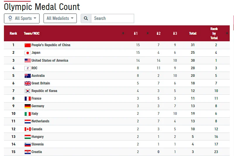 5:37 AM IST: Here's a look at the medal tally, top 15, before the day's first medal event.