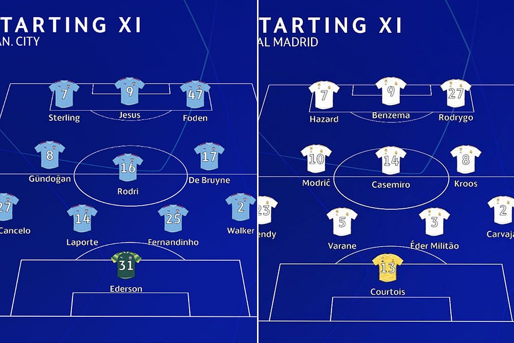 Gabriel Jesus, who played much of the first leg on the left flank before heading in City's equaliser, starts up front in Sergio Aguero's ongoing absence through a knee injury, while Guardiola again appears to have opted for a double pivot in midfield of Ilkay Gundogan and Rodri, who both started at the Santiago Bernabeu.