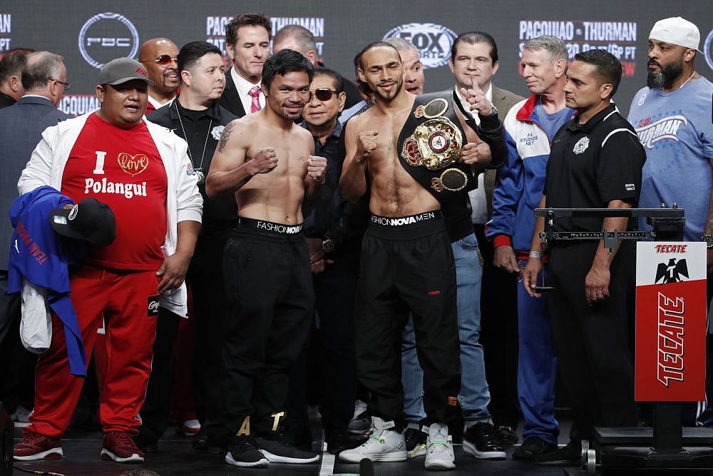 Manny Pacquiao and Keith Thurman both tipped the scales at 146.5 pounds ahead of their much-anticipated WBA world welterweight title clash.