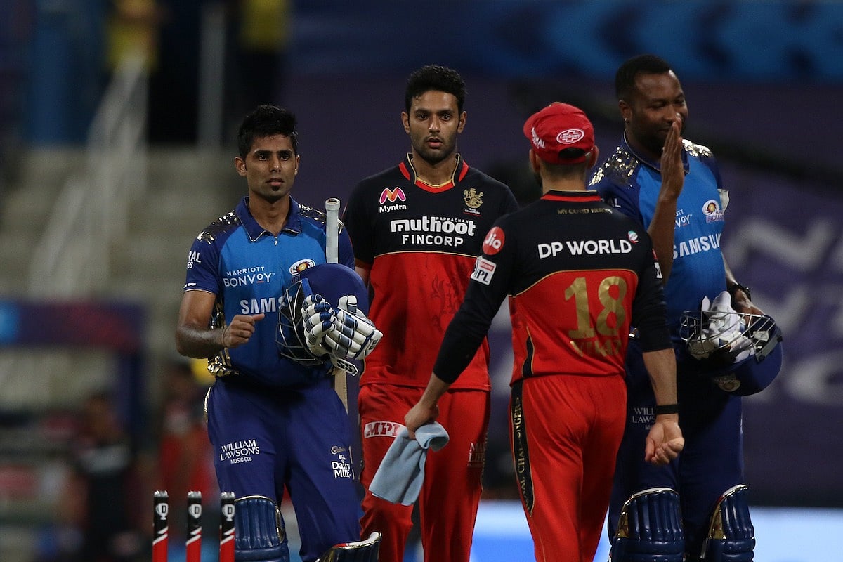 Royal Challengers Bangalore: 164/6 in 20 overs (Devdutt Padikkal 74, Josh Philippe 33; Jasprit Bumrah 3/14); Mumbai Indians: 166/5 in 19.1 overs (Suryakumar Yadav 79 not out; Mohammed Siraj 2/28, Yuzvendra Chahal 2/37).