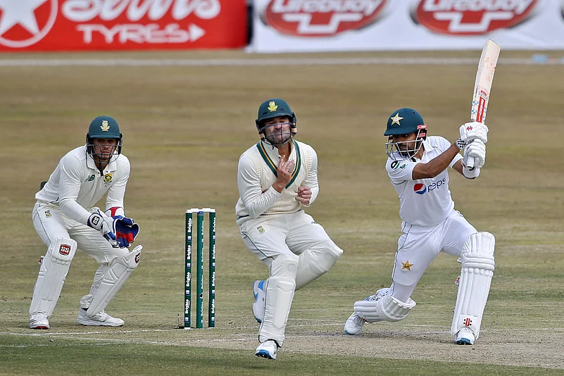 Maharaj (2-51) had Azhar Ali lbw for a duck in his next over and Pakistan looked in serious trouble when Aiden Markram reacted brilliantly at short leg after Anrich Nortje's rapid delivery struck Abid Ali (6) on the thigh and zoomed towards him.