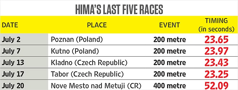 Guwahati-based coach Nipon Das, who is credited with spotting Hima, says it should be remembered that she was returning from an injury. “She didn’t go all out in the 400m race as it was her first after recovering from a back injury she sustained during the Asian Championships in April in Doha. It should also be remembered that she is competing in 200m races only to improve her pet event, 400m,” emphasises Nipon. Hima, the 400m national record holder, remains modest despite the golden streak, perhaps aware of sterner tests ahead, including qualification for the upcoming World Championships (September 27-October 6, Doha) and the 2020 Olympics (July 24-August 9, Tokyo). “There’s no particular reason for winning these gold medals. This is only the warm up season for me and I am simply running. My job is to run. It’s no big deal [winning medals],” Hima tells Outlook from Poland.