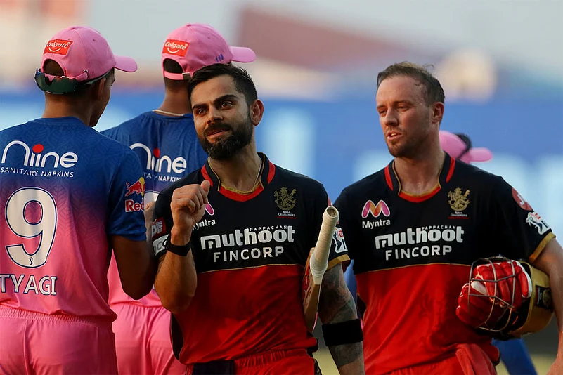 Virat Kohli and AB de Villiers with RR players. Photo - BCCI