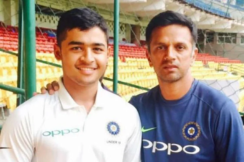 Riyan Parag with coach Rahul Dravid. Photo Courtesy: Twitter/@muva0727