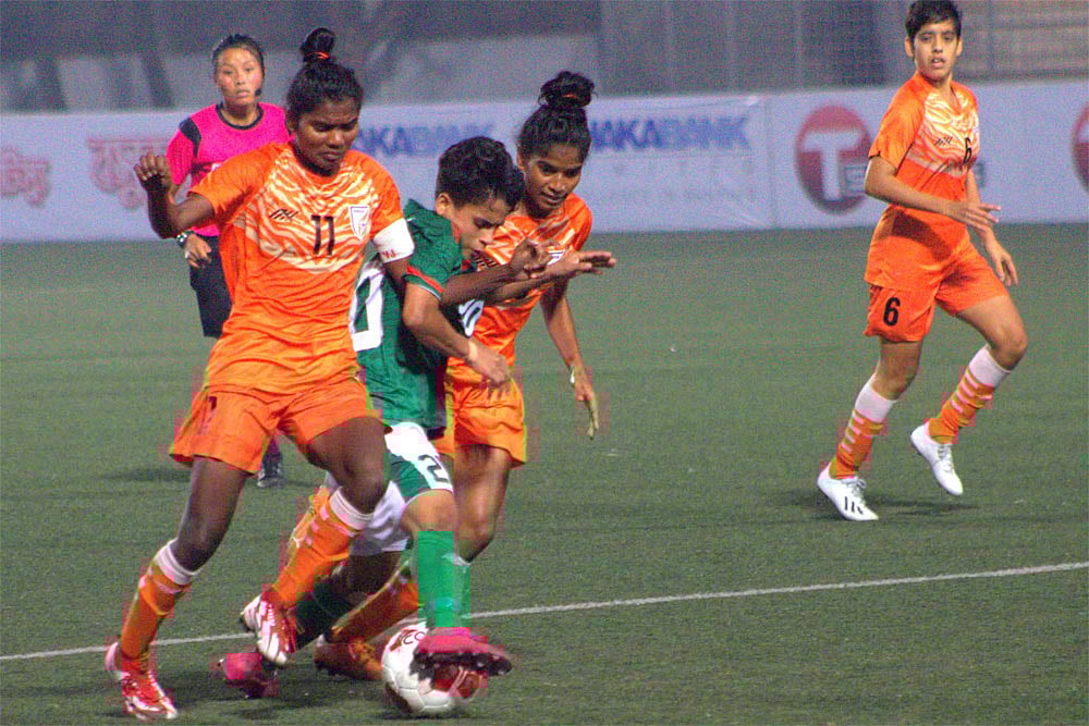 Bangladesh constantly looked to attack down the wing and send in dangerous crosses but the Indian defence, aided by their keeper Anshika, held their ground, thwarting the attacks one after the other.