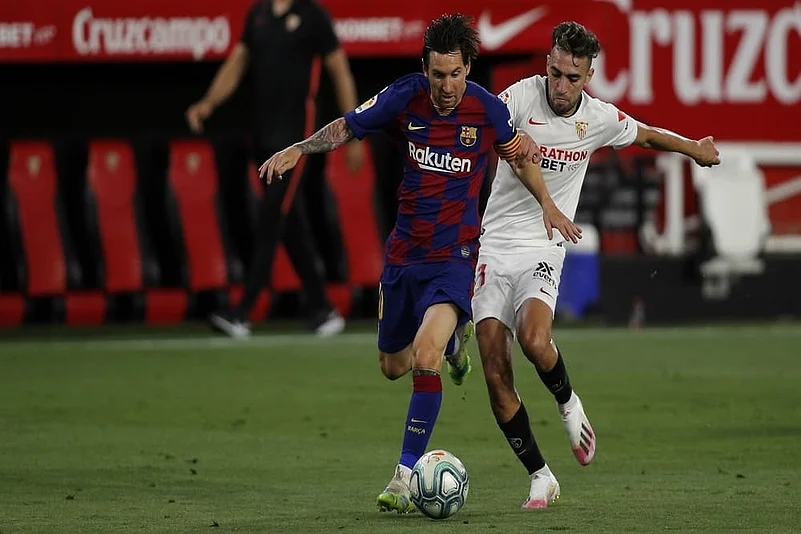 It took two Sevilla players to stop Messi at the expense of a free-kick on the edge of the penalty area at the 20-minute mark.
