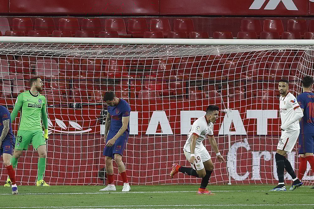 Atleti's lead could be cut to a solitary point if Barcelona beat Real Valladolid on Monday after Marcos Acuna's fine header handed fourth-placed Sevilla their first LaLiga win over the capital club since 2016.