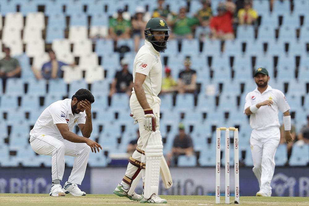 Amla, on eight, was dropped by Fakhar Zaman at third slip off Hasan when he slashed hard at the ball, which flew at chest height to the fielder. In the next over, Elgar, on four, edged new bowler Shaheen Shah Afridi low to first slip where Azhar Ali appeared to take a diving catch.