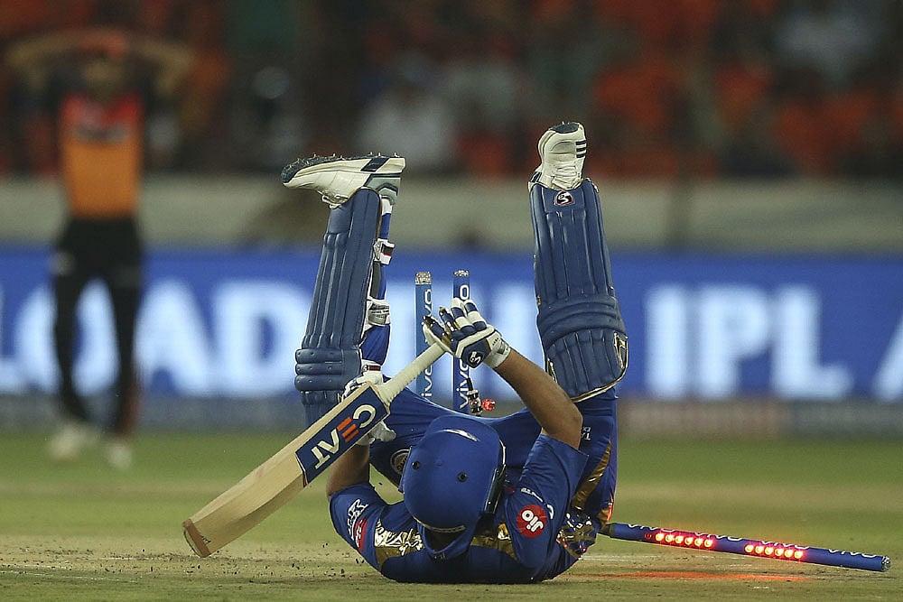 Mumbai Indians captain Rohit Sharma falls on the ground in an attempt to make it to the crease against Sunrisers Hyderabad. (AP Photo/ Mahesh Kumar A.)