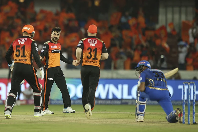 Sunrisers Hyderabad's Rashid Khan, second left, celebrates the dismissal of Mumbai Indians Hardik Pandya. (AP Photo/ Mahesh Kumar A.)