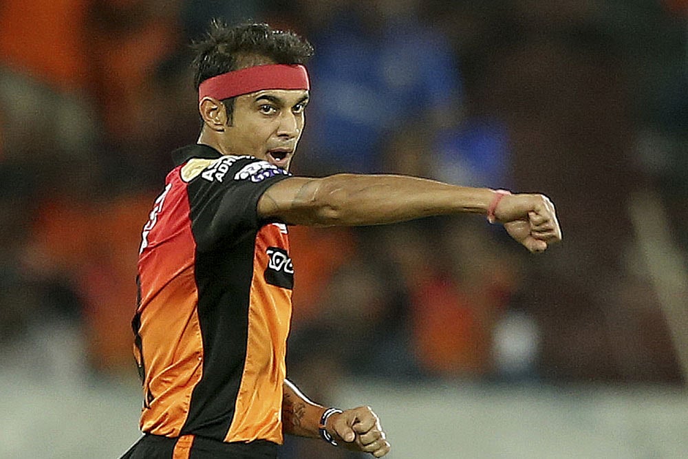 Sunrisers Hyderabad's Siddarth Kaul celebrates the dismissal of Mumbai Indians' Krunal Pandya. (AP Photo/ Mahesh Kumar A.)