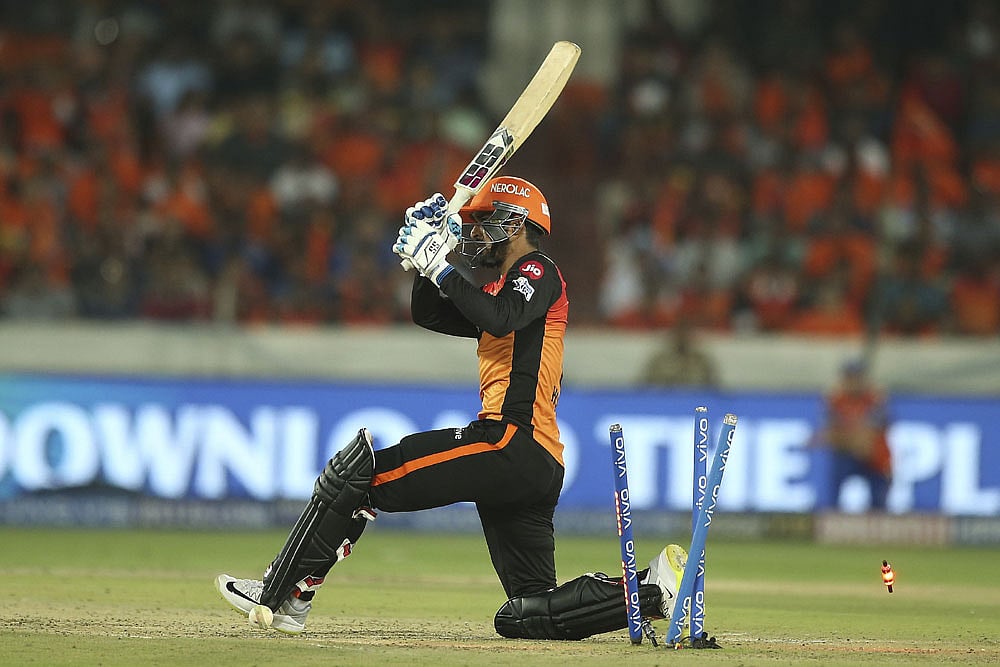 Sunrisers Hyderabad's Deepak Hooda bowled by Alzarri Joseph of Mumbai Indians. (AP Photo/ Mahesh Kumar A.)