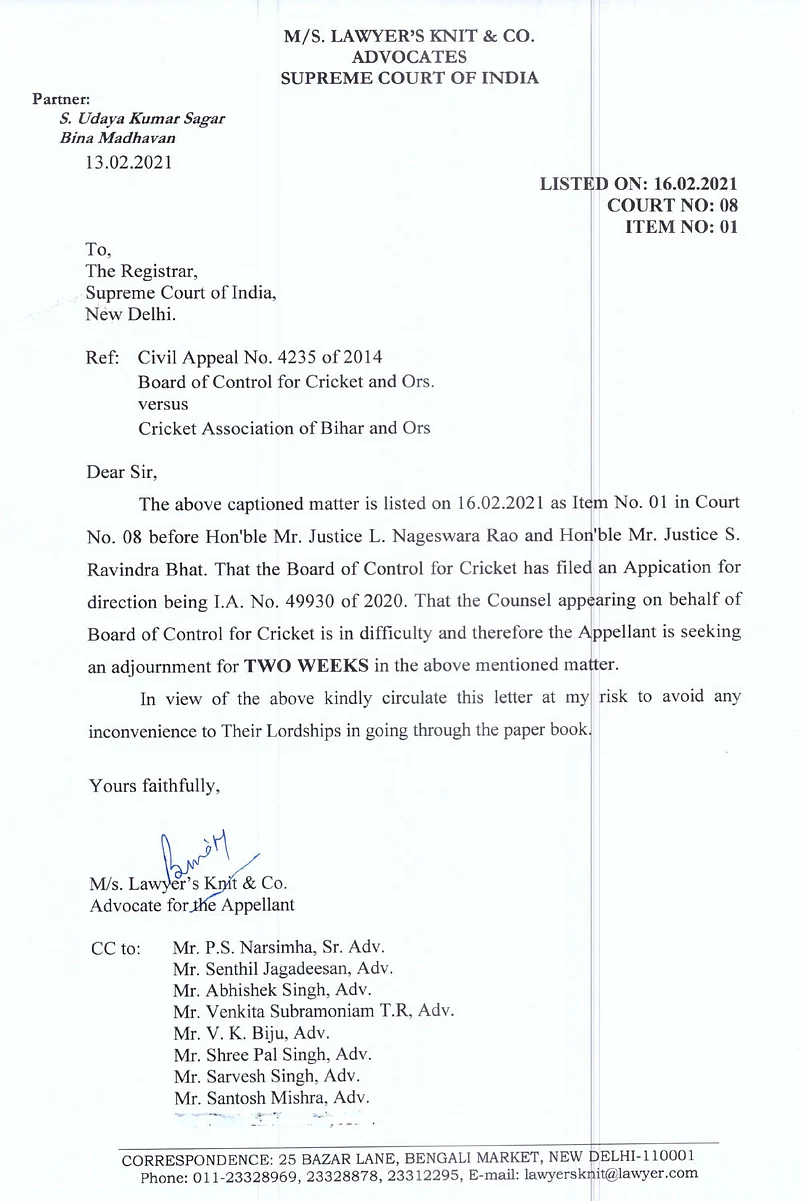 In a letter dated February 13, 2021 to the registrar of the Supreme Court, M/S Lawyer's Knit & Company, has said that "the counsel appearing on behalf of the BCCI is in difficulty and therefore the appellant is seeking an adjournment for two weeks."