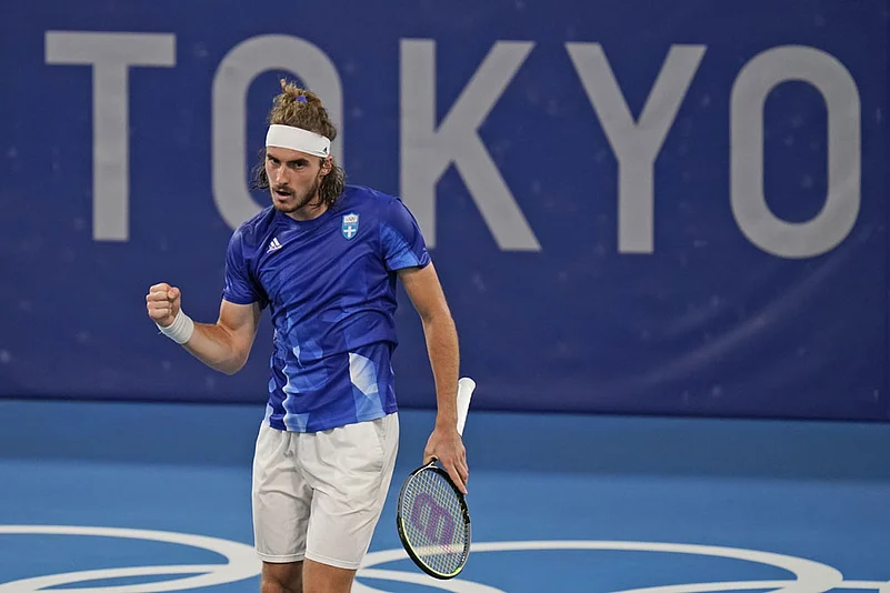 While spectators are barred from most of the Tokyo Games, Tsitsipas had some vocal support from Greek staff members in the stands, who also draped a large Greek flag over a barrier behind one end of the court.