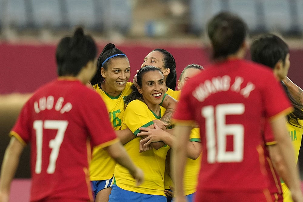 Marta finished with a pair of goals for Brazil, which is ranked No. 7 in the world. Debinha, Andressa Alves and Beatriz also scored.