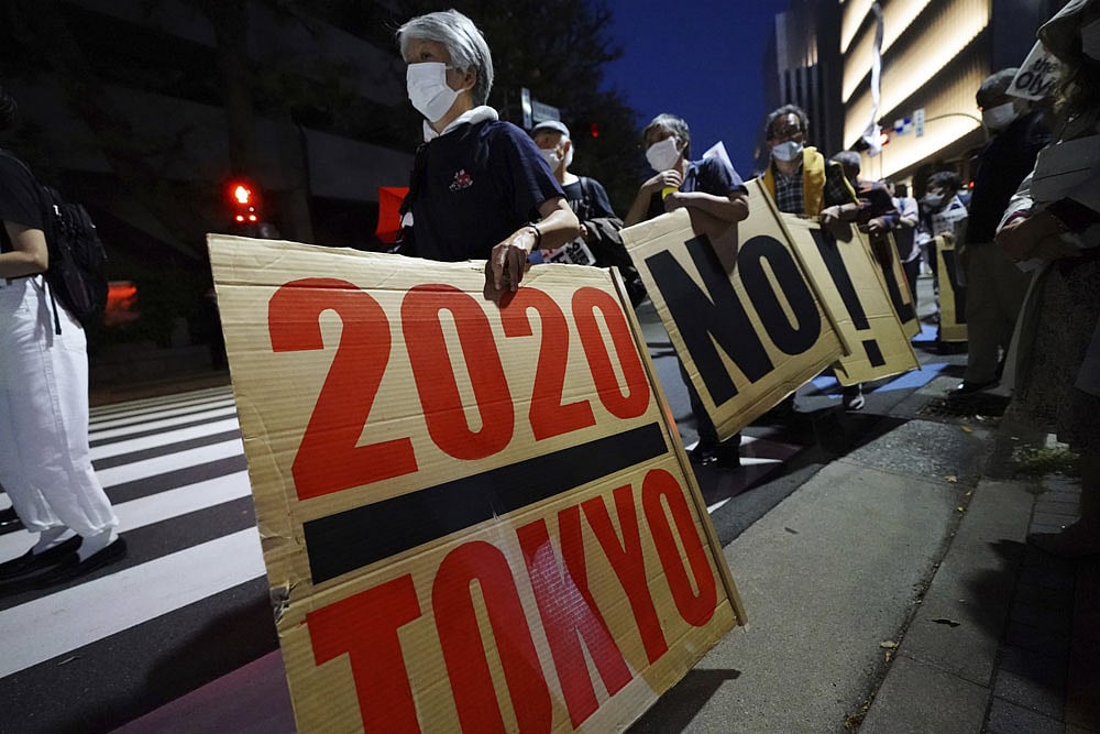 The final question of the news conference, held by video call, was offered to a reporter from Yahoo Sports. Instead, an activist appeared on the screen holding up a black and white banner opposing the Tokyo Olympics.
