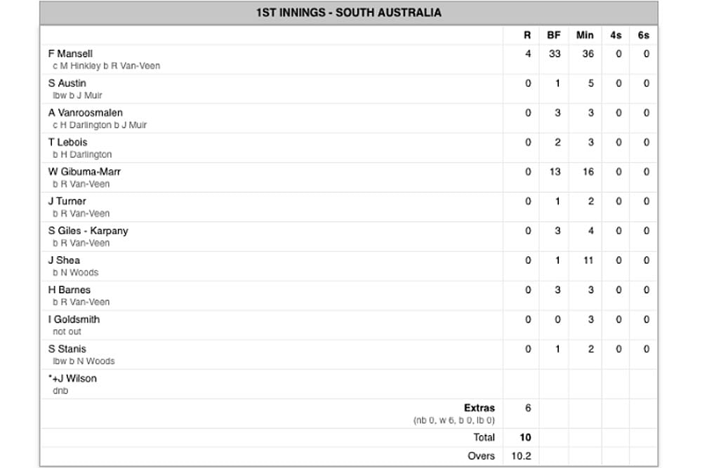 Roxsanne Van-Veen returned the unbelievable figures of five wickets for one run off two overs. Naomi Woods took two wickets with the only two balls she bowled.