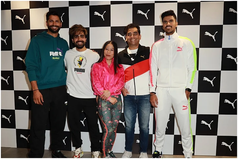 Washington Sundar (R), Mary Kom (3rd From L), Rupinder Pal Singh (L) at a promotional event in Gurgaon. (Photo: Outlook India)