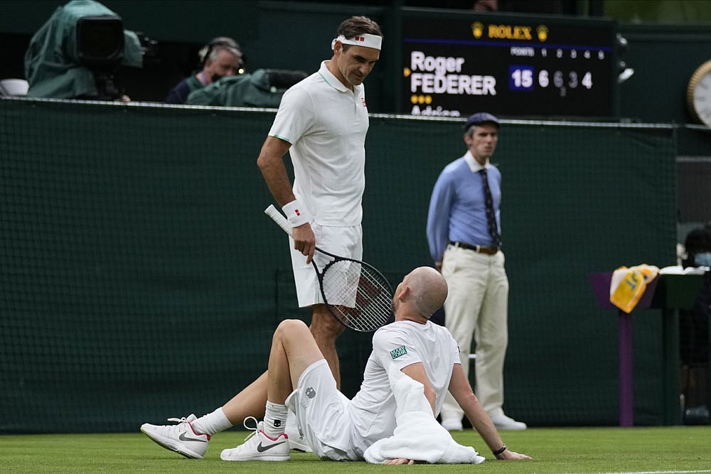 Roger Federer's opponent on Day 2, Adrian Mannarino, lost his footing in the main stadium, too, but he was not so lucky: The Frenchman's 33rd birthday ended with a twisted knee and a loss, because he was too hurt to keep playing.