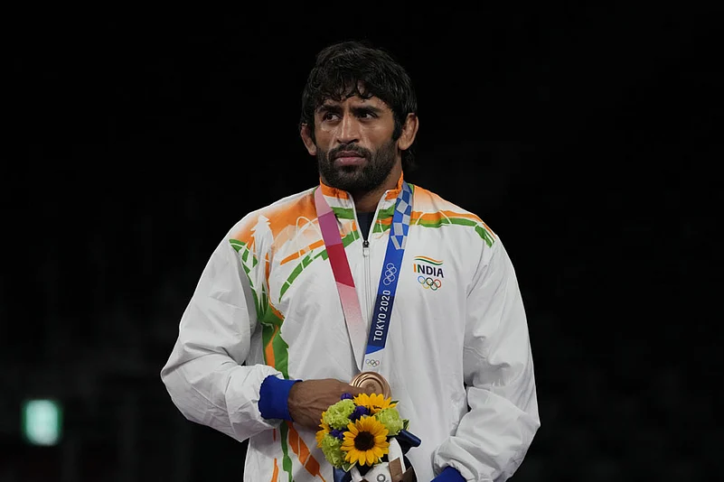 Bajrang Punia stands on the podium with his bronze medal during the medal ceremony for men's freestyle 65kg wrestling on August 7, 2021. AP photo.