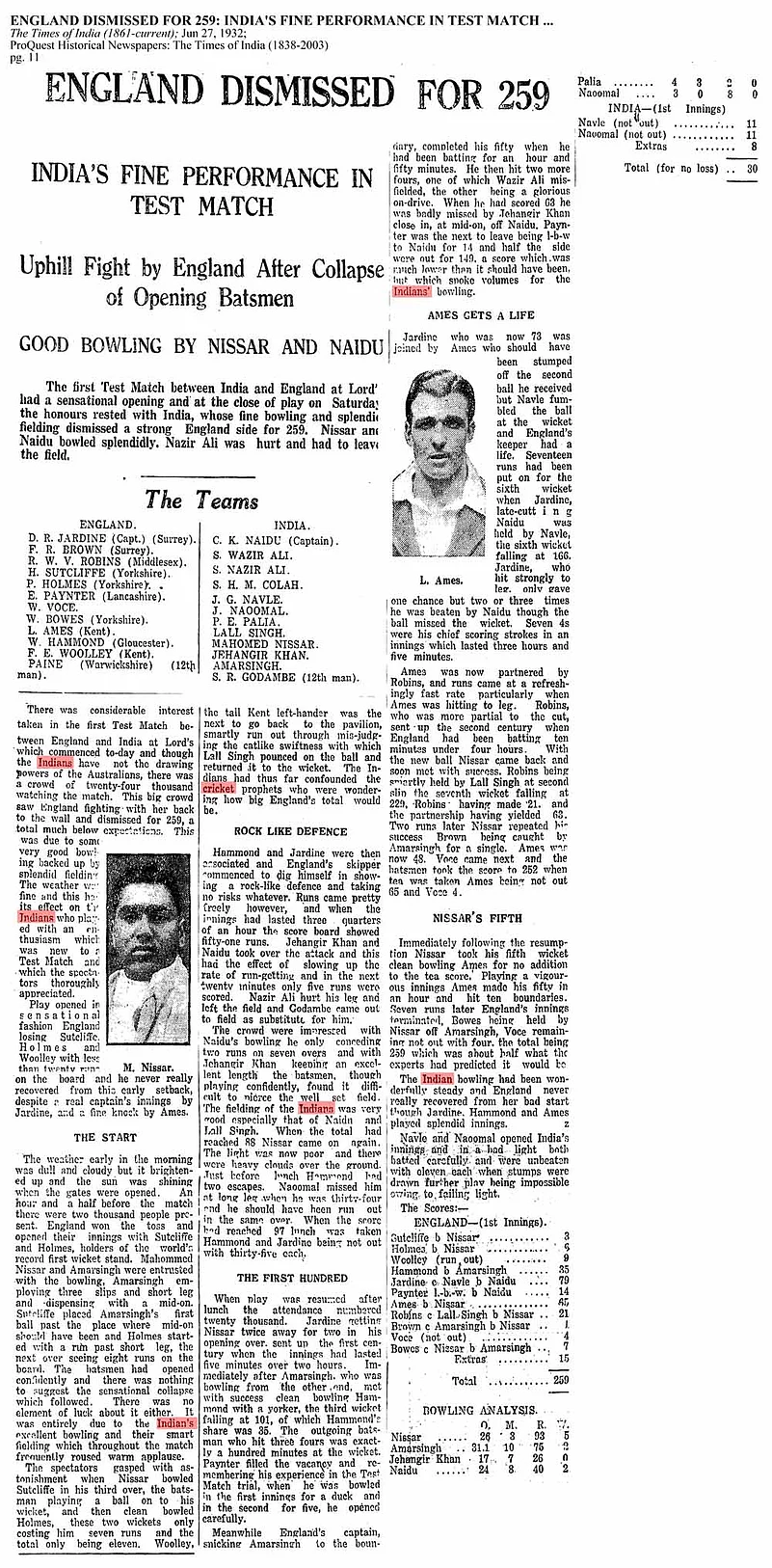 England 259 (Jardine 79, Ames 65, Nissar 5/93)