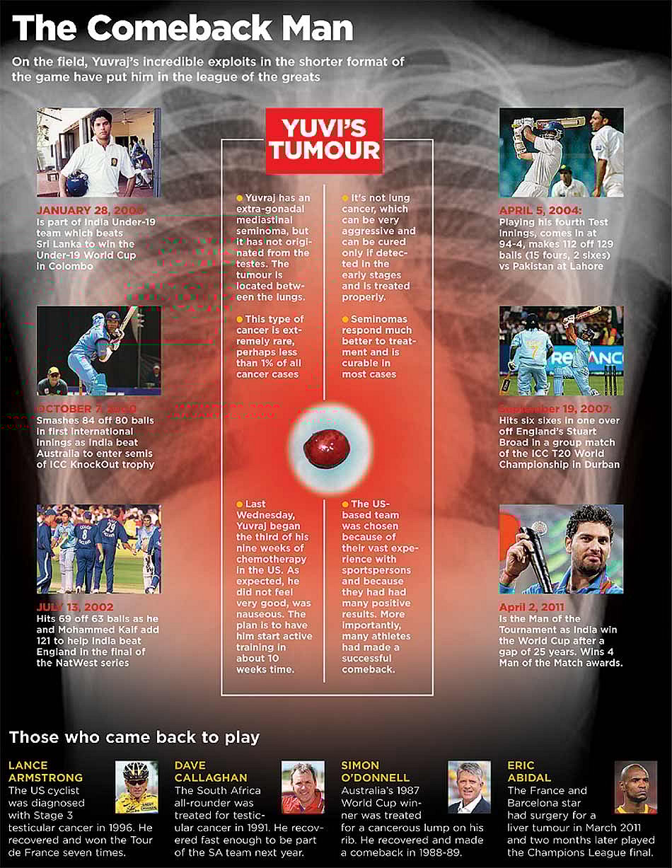 May 20, 2011. Yuvraj flies from Mumbai to Delhi and drives straight to G-Scan Imaging and Diagnostics Centre in south Delhi—he’s there only to inaugurate its new section catering to alternative medicine. Nothing ails him, other than the cough, that persistent cough that had been bothering him for months by then. But wasn’t that just a cough? What chance did a mere cough have against Yuvraj, 29, in the prime of his life, the man who won the Cup for India the previous month? That day, though, the cough is a bit too bothersome. The doctors suggest an X-ray imaging of his chest, just in case. Yuvraj says OK, I’ll be back two days later, after playing Pune’s last match in the IPL. A week later, he pulls out of the ODI team to tour the West Indies.