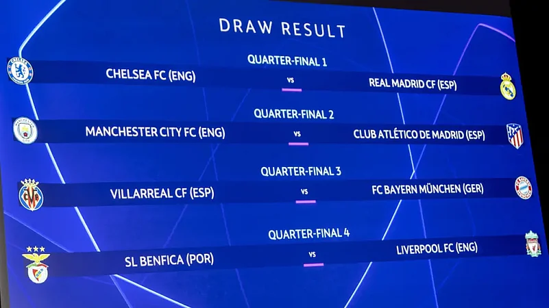 In the semifinals, Manchester City or Atlético Madrid will play Chelsea or Real Madrid, and Benfica or Liverpool will face Villarreal or Bayern Munich.
