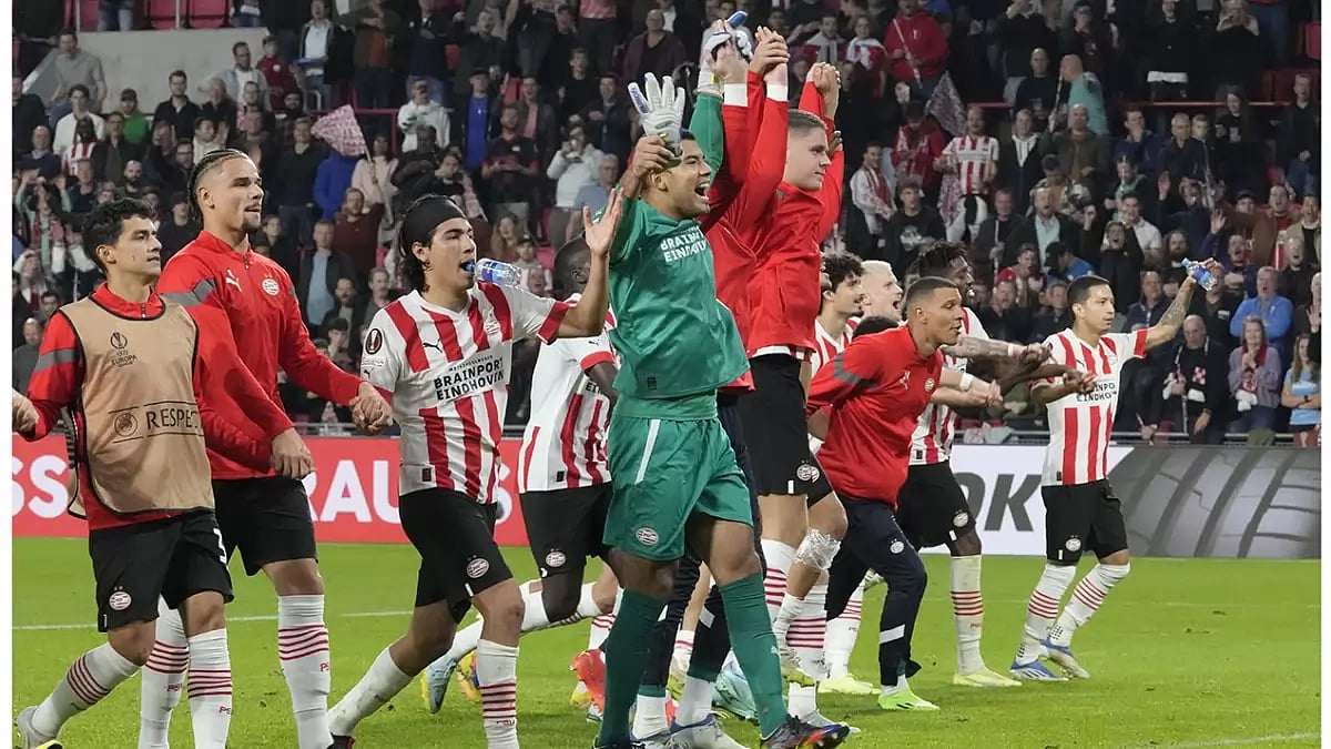 PSV Eindhoven became the first team to hold Arsenal scoreless this season, beating the Gunners 2-0 to keep alive the fight for first place in Group A. Joey Veerman and substitute Luuk de Jong scored in the second half for PSV to hand Premier League leader Arsenal only its second loss of the season in all competitions and first in the Europa League. De Jong set up Veerman to shoot past Aaron Ramsdale from inside the area in the 56th minute before heading in the second seven minutes later. PSV forwards Cody Gakpo and Xavi Simons had a goal each disallowed due to offside in the first half. Arsenal still leads Group A with 12 points, with Eindhoven second on 10 with one round remaining.