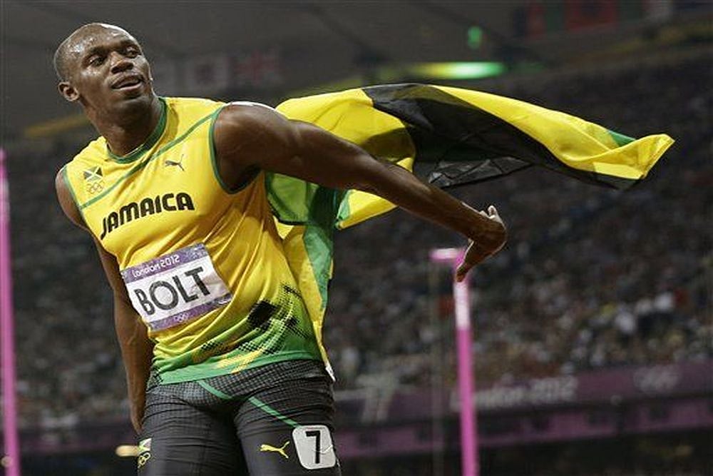 Stripped to a vest and tight shorts in the black, green and yellow of Jamaica, chants of "Usain Bolt" rang around in a surprisingly tense atmosphere.