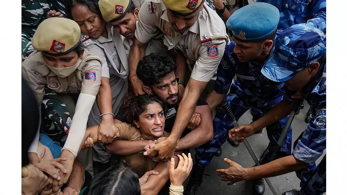 Unprecedented scenes of police dragging Olympic and world championships medallists, including Sakshi Malik, Vinesh Phogat, Bajrang Punia and Sangeeta Phogat, were witnessed when the wrestlers and their supporters breached the security cordon during their march towards the new Parliament building for the planned women's 'Mahapanchayat' on Sunday.