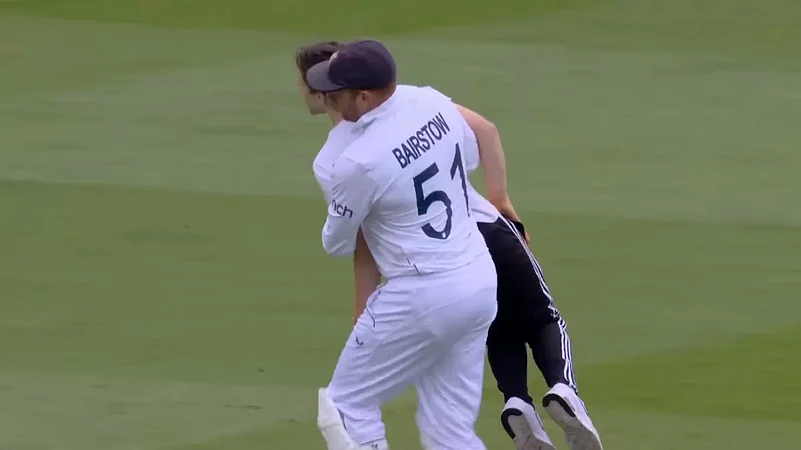 Just before England pacer Stuart Broad was about to start his over, the protestors entered the field and caused chaos. However, wicket-keeper Jonny Bairstow was seen carrying off one of the protestors off the field.