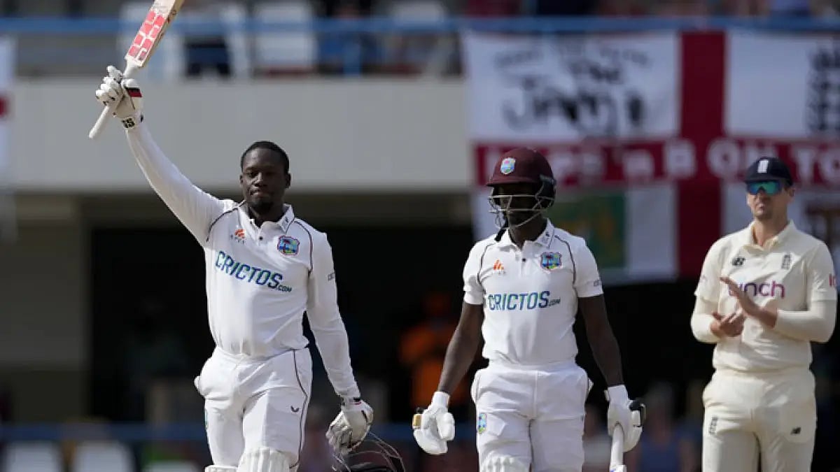 He earned his second test century in his 10th test straight after tea with a sweep to the boundary off Leach. He jumped into Roach's arms.