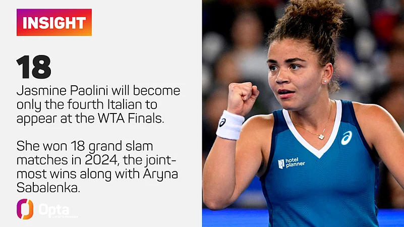 At the age of 28 years and 303 days, she will become the second-oldest player to make their maiden WTA Finals appearance as a top-five ranked player, after Li Na (29 years and 241 days) in 2011 – since the WTA rankings were first published in 1975. Paolini (18) won the joint-most matches at grand slam events in 2024, along with Sabalenka.