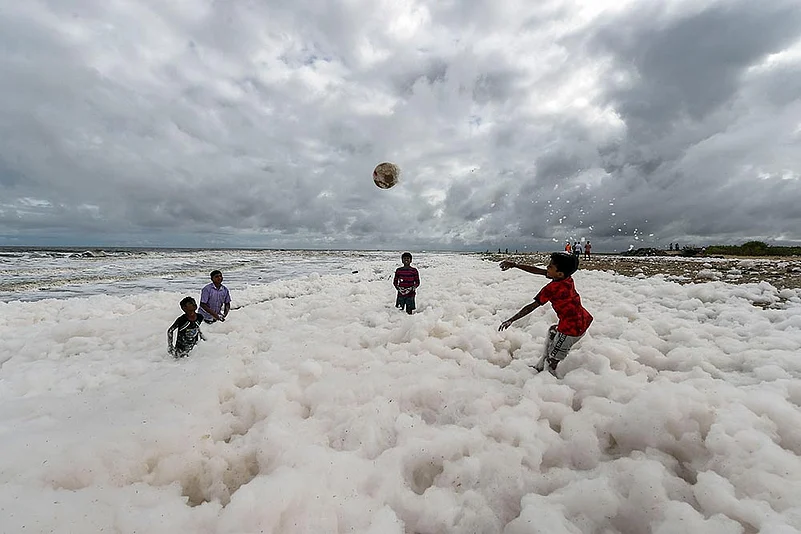 Kids play in a toxin-filled froth that covered Chennai’s Marina beach; rain carried untreated sewage and phosphate down to the sea. Similar pollution in 2017 killed thousands of fish