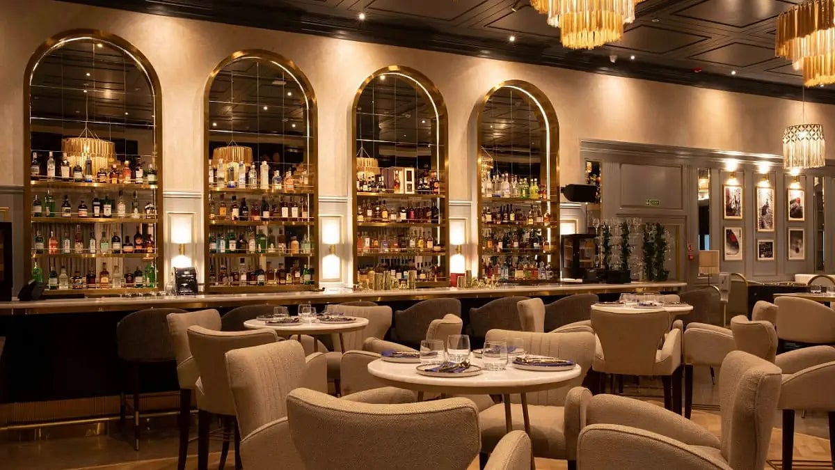 Designed with minimal European decor, Ditas Mumbai is divided into two areas, starting with a long-running patio with wicker and cane chairs, and patterned tiles which bring to life a cafe vibe, and leading up to the main space where the bar has a high mirrored arch display. The onyx stone counter and their kitchen setup add to the food-centric energy. With Moroccan blue tiles, as a call back to their Delhi interiors, and electric mid-century furniture, the Soho living room style seating places you in a luxurious high-end lounge.