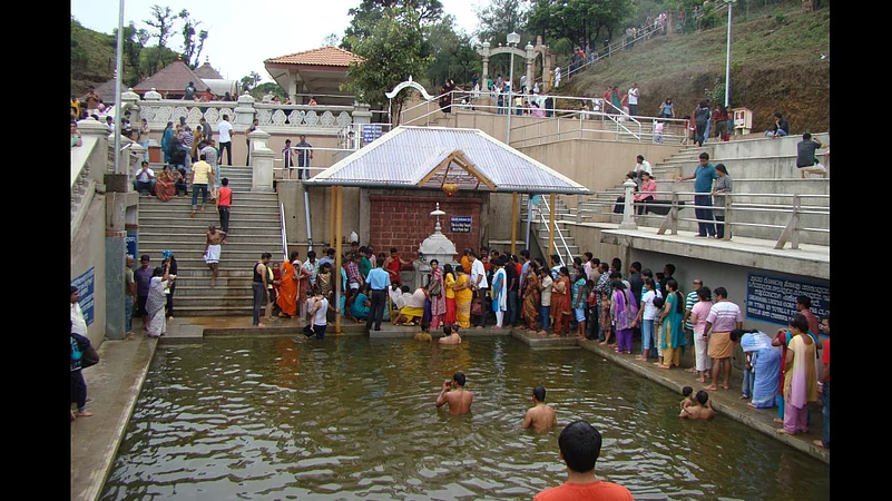 Located in the Brahmagiri Hills in Karnataka’s Coorg district, Talakaveri is generally considered to be the source of the Kaveri. A tank and a temple (in honour of the goddess Kaveramma) have been built at the spot the river is said to originate. The river itself feeds off a spring close to the tank. In normal times, thousands of Hindu devotees visit Talakaveri at the time of the Kaveri Sankramana, a festival that celebrates the annual emergence of the river. Talakaveri also offers excellent panoramic views of the surrounding Western Ghats.
