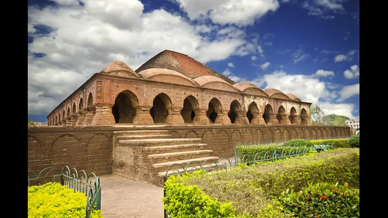 The Ras Mancha in Bishnupur, datable to the 17th century, is a unique structure – a pyramidal structure built on a laterite plinth; the central shrine is enclosed within a network of corridors.
