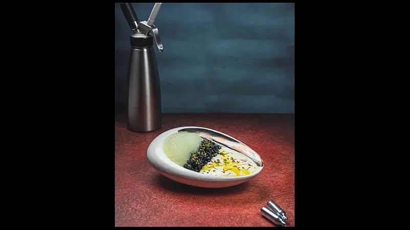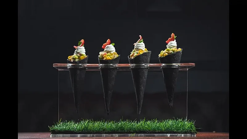 I picked up a spoonful of what looked like black pearls nestling against saffron esfuma and a scoop of ‘rabri’. The pearls crunched noisily as I bit into them, and hey, they tasted like ‘jalebi’. The dish was a pure delight. Activated charcoal disguised the cardamom flavoured Jalebi pearls. And the use of espuma (froth or foam in Spanish) helped eliminate the use of any non-vegetarian emulsifying agent for the foaming.