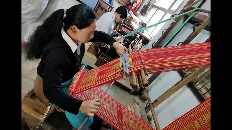 When weaving, cotton yarn is wound in wooden frames (according to specified length and breadth) and fitted in a vertical loom. Traditional ones are known as the loinloom (used across the northeast) due to the fact that it is placed on the weaver's lap and used. The DHH has applied for the Geographical Indications (GI) registration of this art.