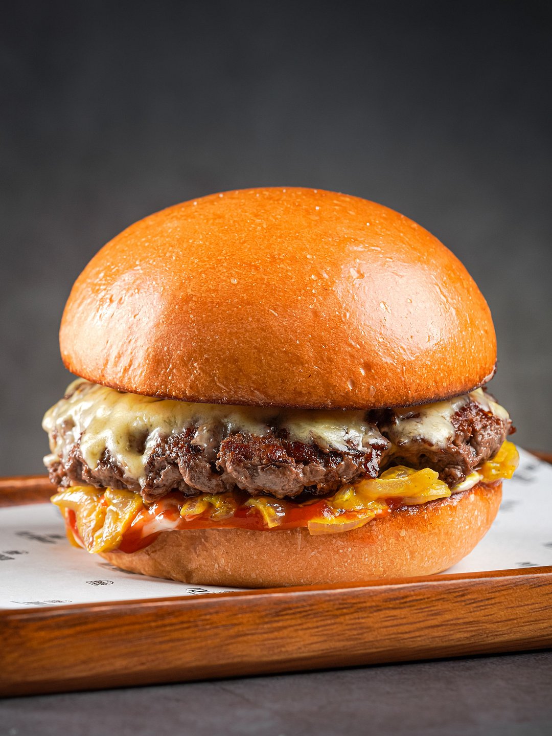 A quintessential American favourite, made of a ground meat patty served in a bun, often accompanied by lettuce, tomato, onion, pickles, and condiments like ketchup and mustard.
