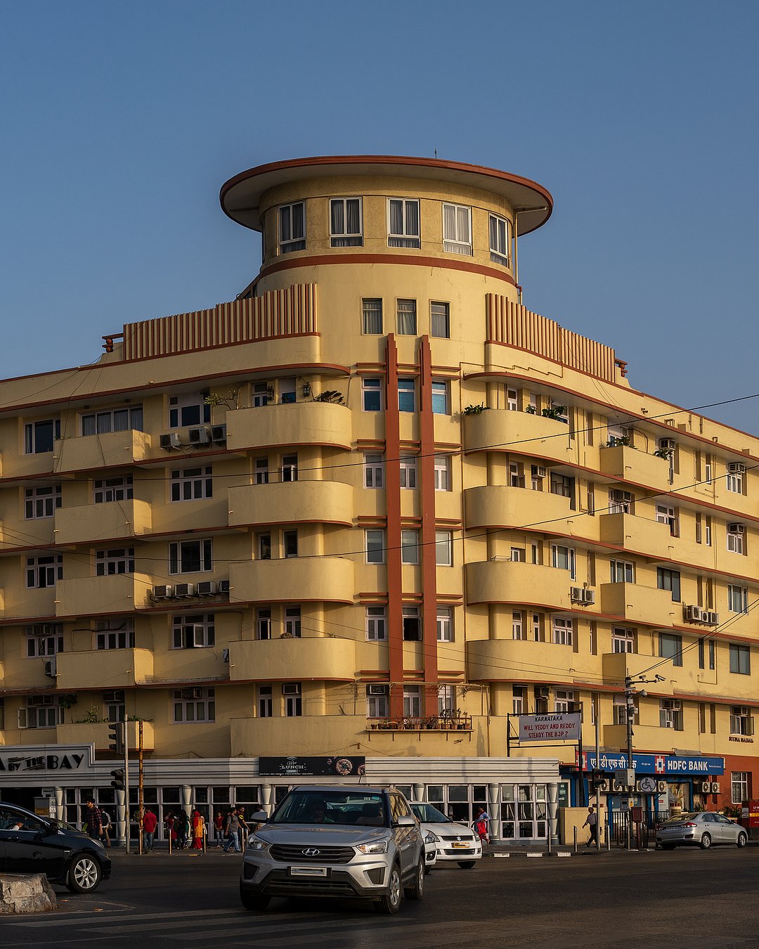 A 1938 landmark by Shorabji Bhedwar, featuring a red sandstone façade, ziggurat roofline, and murals, epitomising Mumbai's Art Deco elegance.