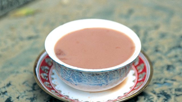 Nun chai, or Gur-gur chai as it is known across the Zojila, is a pinkish salted tea made by boiling tea, with soda of baking soda and water in a samovar. Once the tea has been boiled down to a concentrate, salt and more water are added to the samovar. It has a pungent salty taste, which is incredibly heating and lingers in the throat for a while. Gur-gur chai is largely the same, except that the tea is churned with a dasher, in salt and refined yak butter, in a cylindrical wooden churn known as a gur-gur. Gur-gur chai is however, much more popular in its native provinces than its counterpart, which often loses out to the cardamom and almond dashed Kahwa.